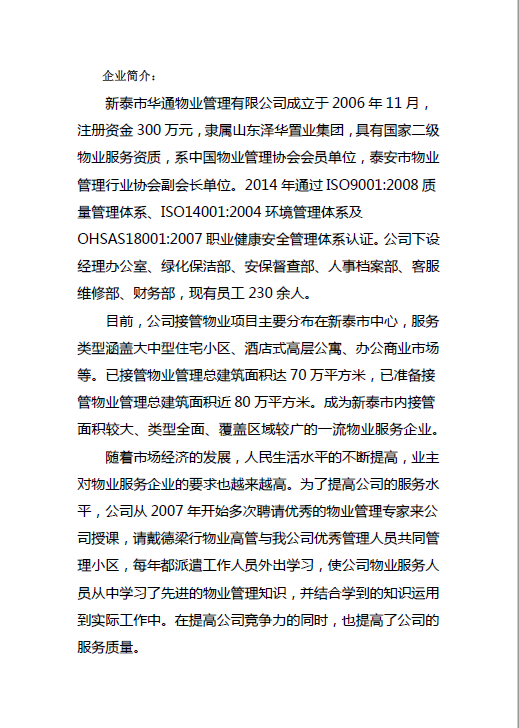 新泰市华通物业管理有限公司质量信用报告