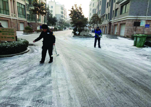 景观绿化上的积雪给人赏心悦目的感觉,但是道路上的积雪却让人头痛,走路怕滑倒,骑车怕溜车,很是无奈。于是华通物业公司各小区管理处工作人员为了保障各位业主们的出行安全,组织人员进行小区内道路积雪清扫工作。今天刚刚上班的时候保安、保洁、绿化等工作人员全部出动,手持大扫帚、铲子在道路上进行积雪的清扫,有上冻的情况就用铲子清理,保证了道路的通畅,保障了业主们的出行安全。(张迁)
